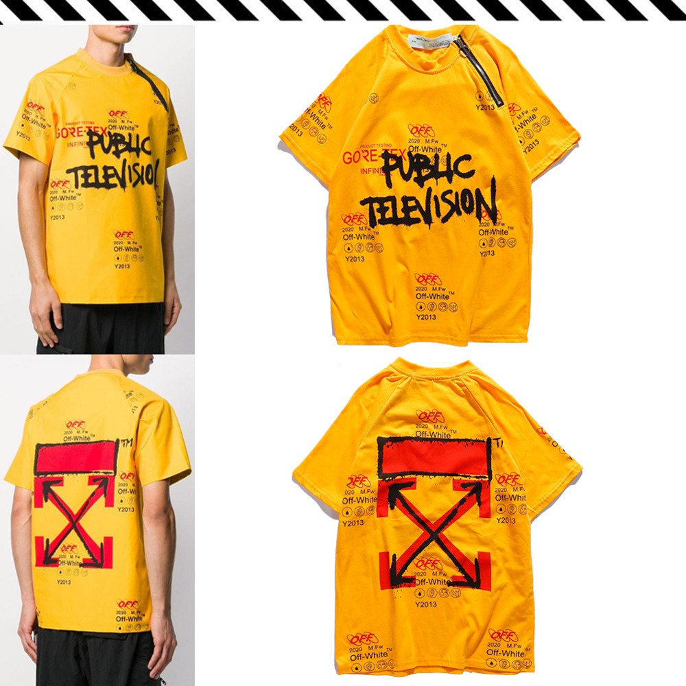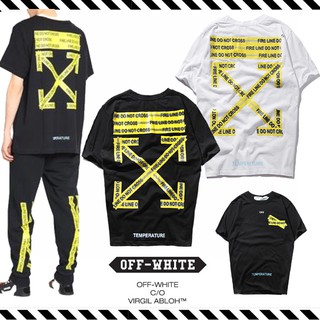 Off White Short Sleeve Yellow Warning Strip Print Couple Loose T Shirt Shopee Malaysia